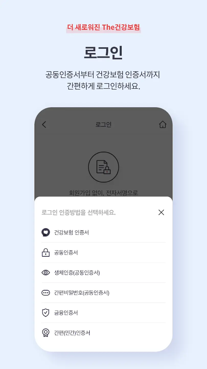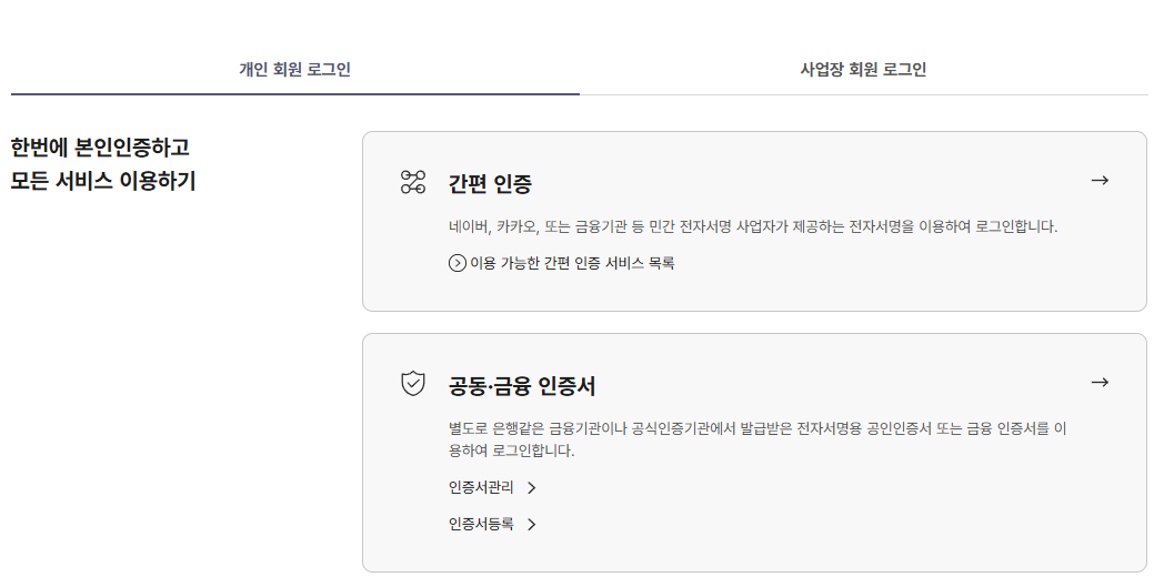 로그인 방식을 선택합니다. : 공동인증서 (구 공인인증서) / 간편 인증 (네이버, 카카오, PASS, 삼성패스 등)