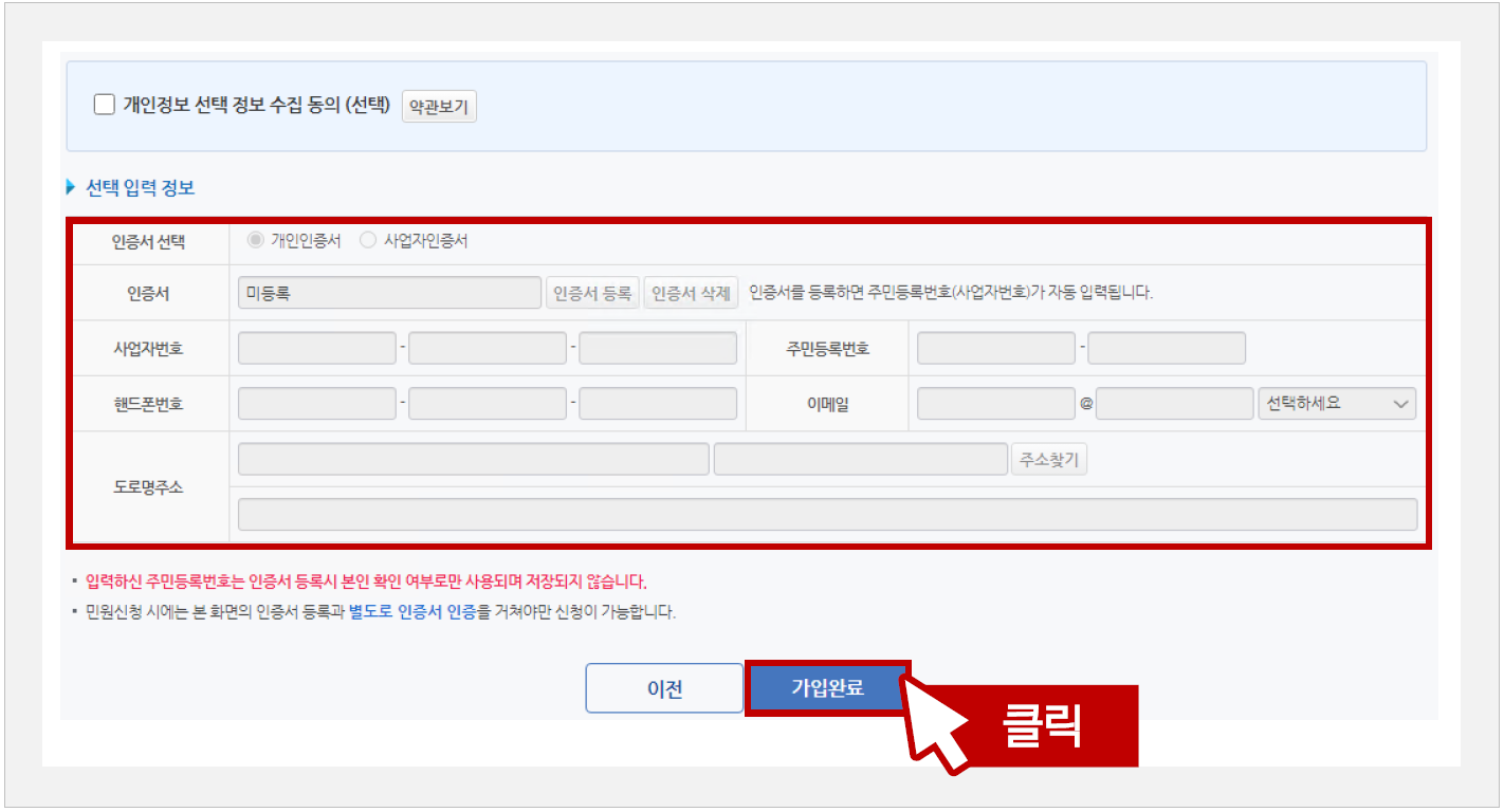 04 회원가입 정보입력 화면 에서 필요시 선택약관의 약관보기 버튼 을 클릭하여 약관을 확인하고 체크한 후 선택 입력 정보를 입력합니다. 가입완료 버튼 을 클릭하면 회원가입이 완료됩니다.