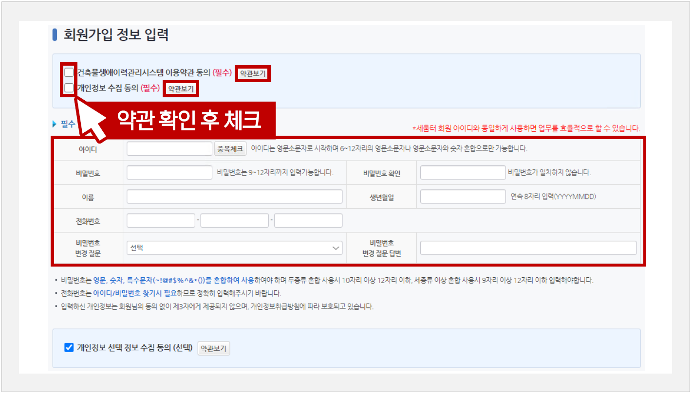회원가입 정보입력 화면에서 필수약관의 약관보기 버튼 을 클릭하여 약관을 확인하고 체크한 후 필수 입력 정보를 입력합니다.