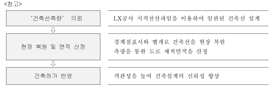 ① 한국국토정보공사에 '건축선 측량'을 의뢰하면 공사는 지적전산파일을 이용하여 건축선을 설계하고 현장에 복원함으로써 건축선의 일관성 확보