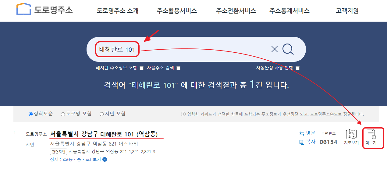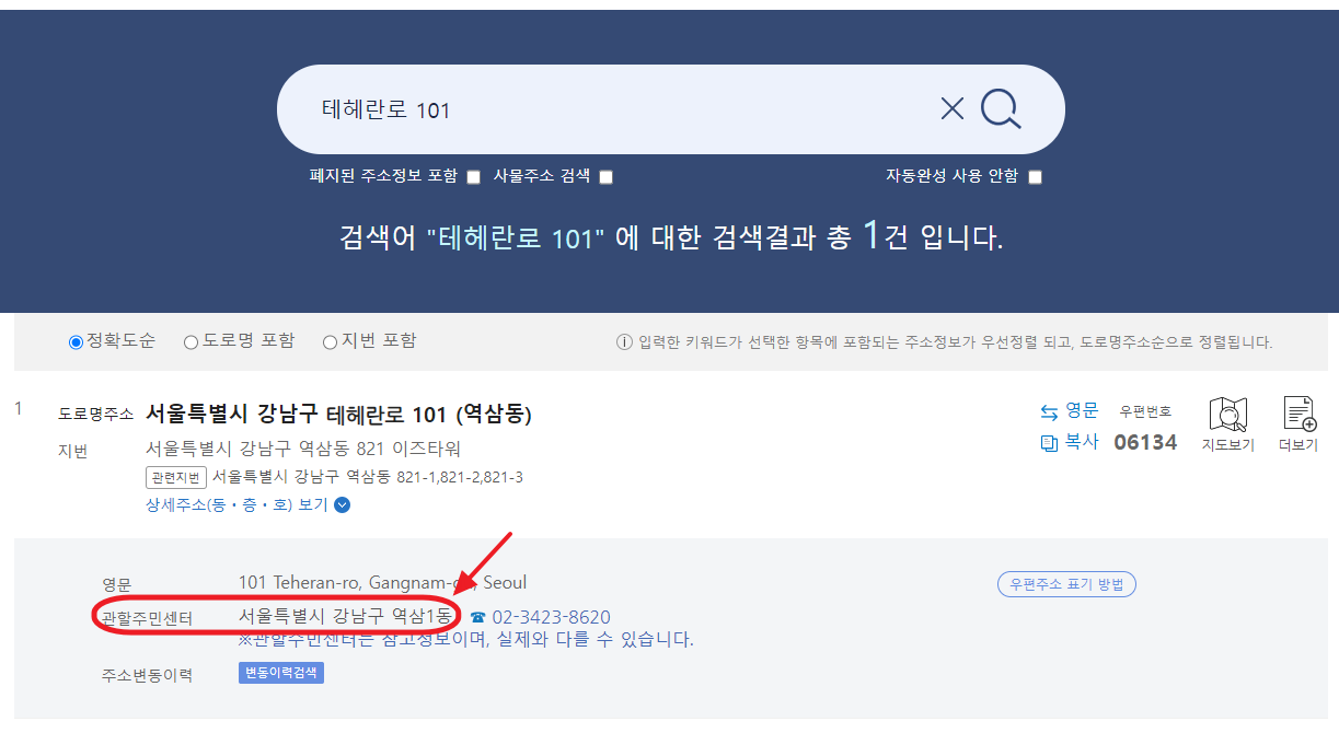 도로명 '테헤란로 101'의 경우 역삼1동 주민센터가 관할인 것을 확인할 수 있습니다.