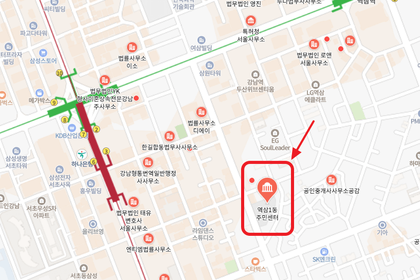 지도로 '역삼1동 주민센터'를 확인했더니 체크한 이곳입니다.