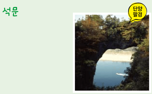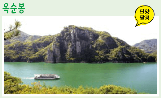 희고 푸른 바위들이 힘차게 솟은 모습이 대나무 싹과 같다 해서 '옥순봉'이라고 부릅니다. 단양 군수였던 퇴계 이황이 석벽에 '丹丘洞門(단구동문)'이라는 글자를 남겼습니다.
