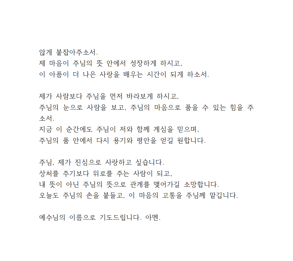 주님, 이 관계를 회복시켜 주시든, 아니면 떠나보내게 하시든, 제가 끝까지 사람을 미워하지 않게 하시고, 상처 속에서 나를 잃지 않게 붙잡아주소서. 제 마음이 주님의 뜻 안에서 성장하게 하시고, 이 아픔이 더 나은 사랑을 배우는 시간이 되게 하소서.