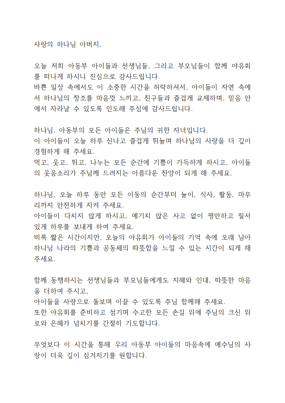 '아동부 야유회 기도문 (어린이 교회학교)'