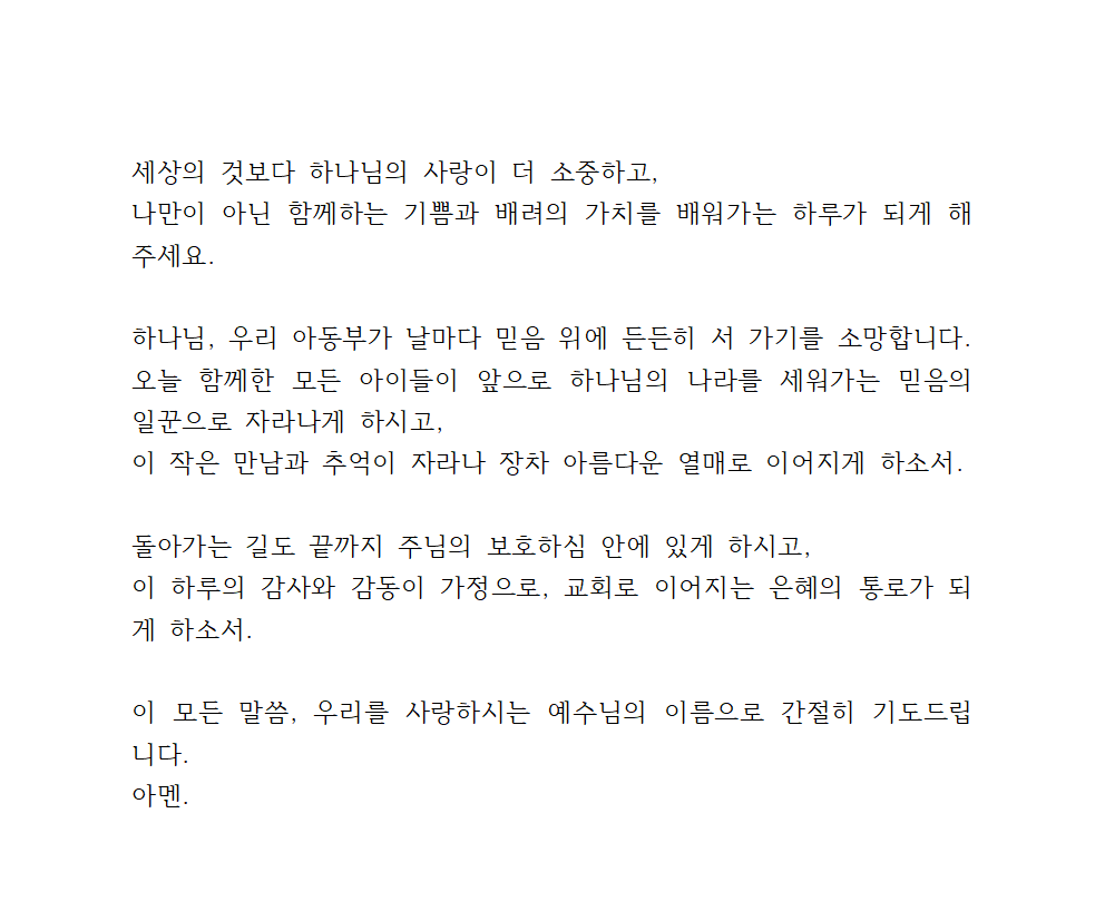 바쁜 일상 속에서도 이 소중한 시간을 허락하셔서, 아이들이 자연 속에서 하나님의 창조를 마음껏 느끼고, 친구들과 즐겁게 교제하며, 믿음 안에서 자라날 수 있도록 인도해 주심에 감사드립니다.