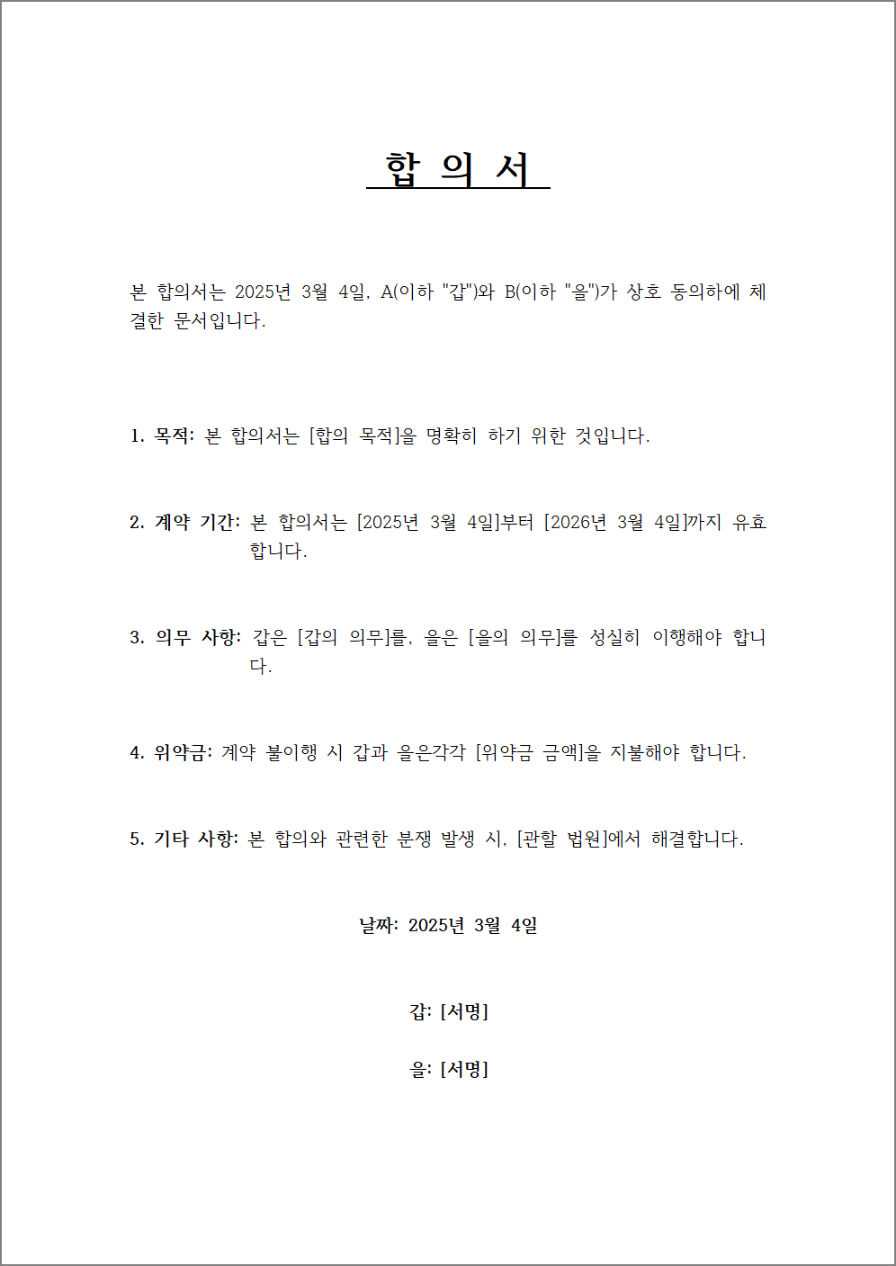 - 합의 내용: 구체적인 합의 사항을 명확하게 기술합니다.