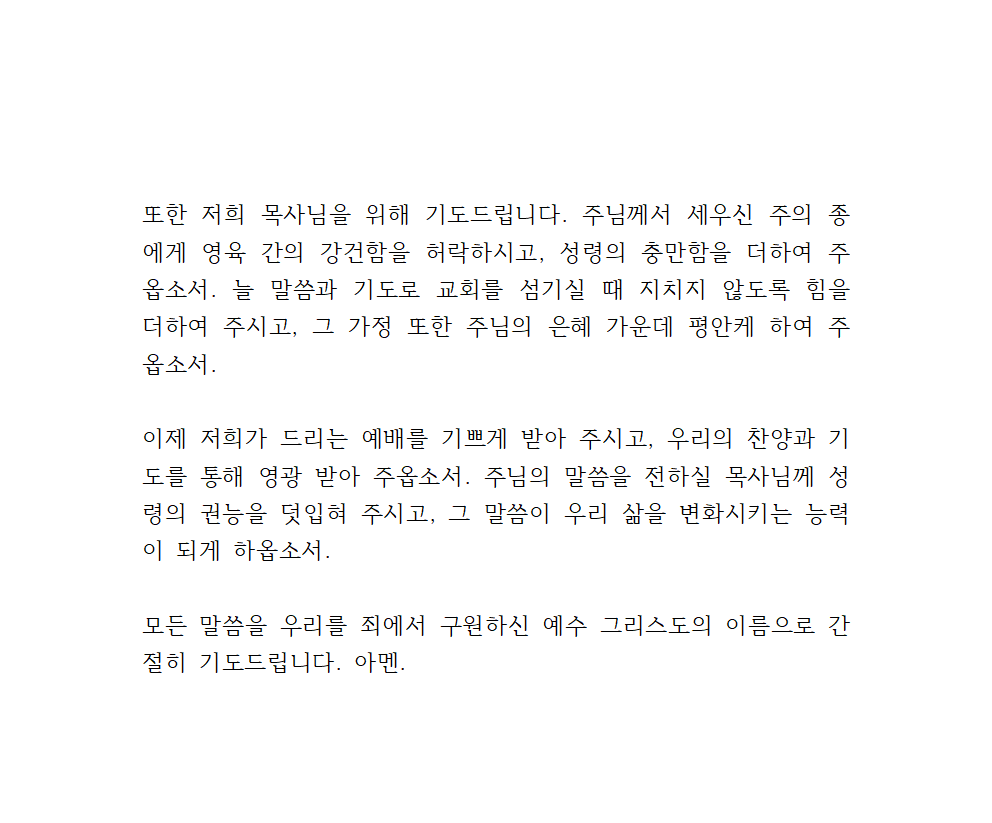 또한 저희 목사님을 위해 기도드립니다. 주님께서 세우신 주의 종에게 영육 간의 강건함을 허락하시고, 성령의 충만함을 더하여 주옵소서. 늘 말씀과 기도로 교회를 섬기실 때 지치지 않도록 힘을 더하여 주시고, 그 가정 또한 주님의 은혜 가운데 평안케 하여 주옵소서.