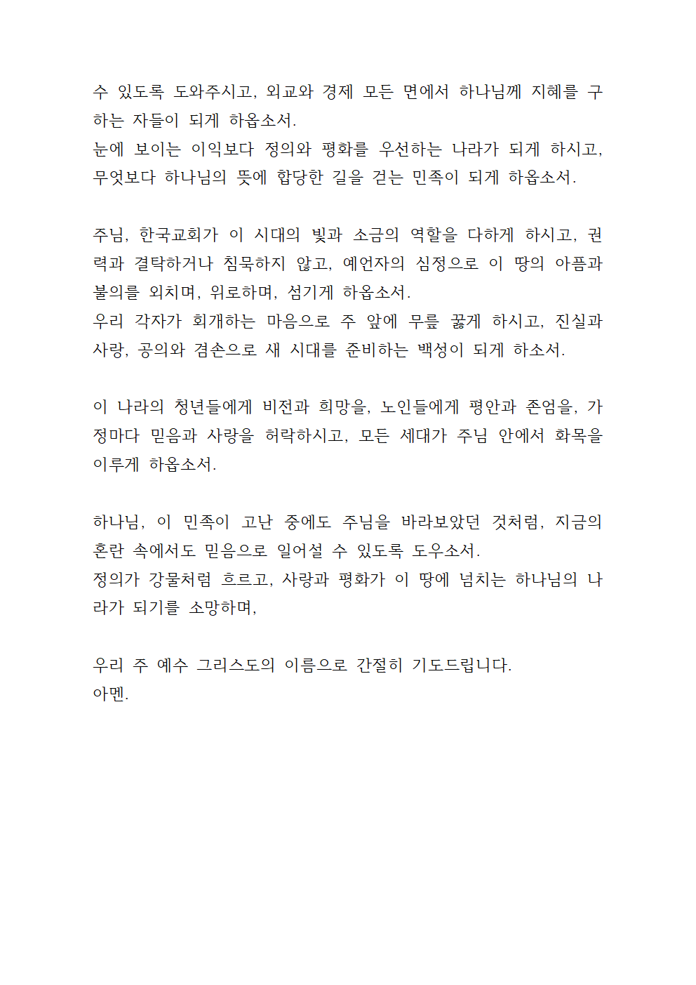 주님, 저희가 살아가는 이 시대의 위기 속에서도 하나님의 뜻을 따르고, 정직과 사랑으로 서로를 섬기며 살아가는 거룩한 백성이 되게 하소서. 우리 사회에 분열과 갈등이 아닌, 화해와 연합, 나눔과 회복의 문화가 자리 잡게 하시며, 정치와 경제, 교육과 문화, 과학과 복지 등 모든 분야가 하나님의 공의와 지혜 안에서 바르게 서게 하옵소서.