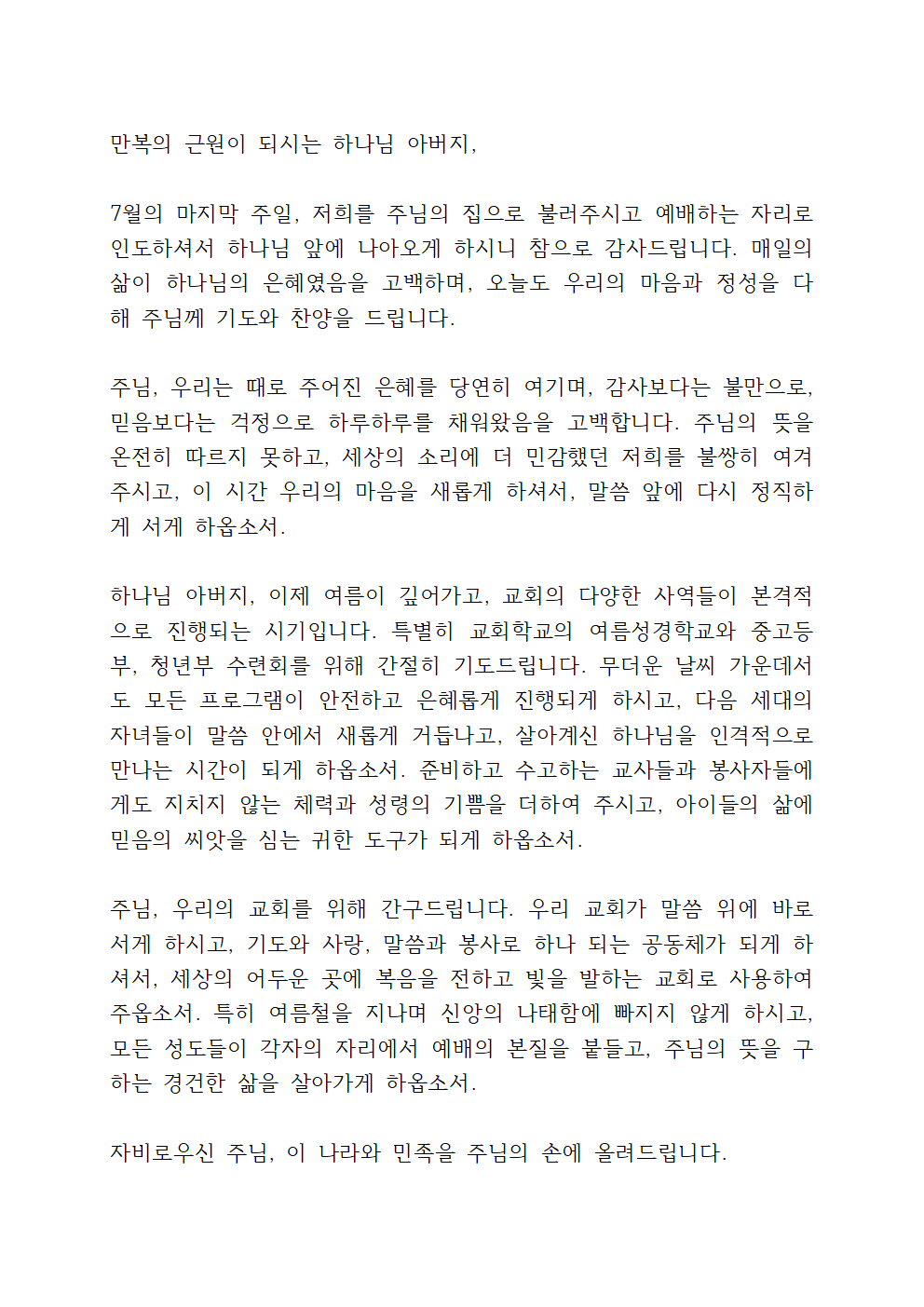 7월 넷째주 대표기도문 1