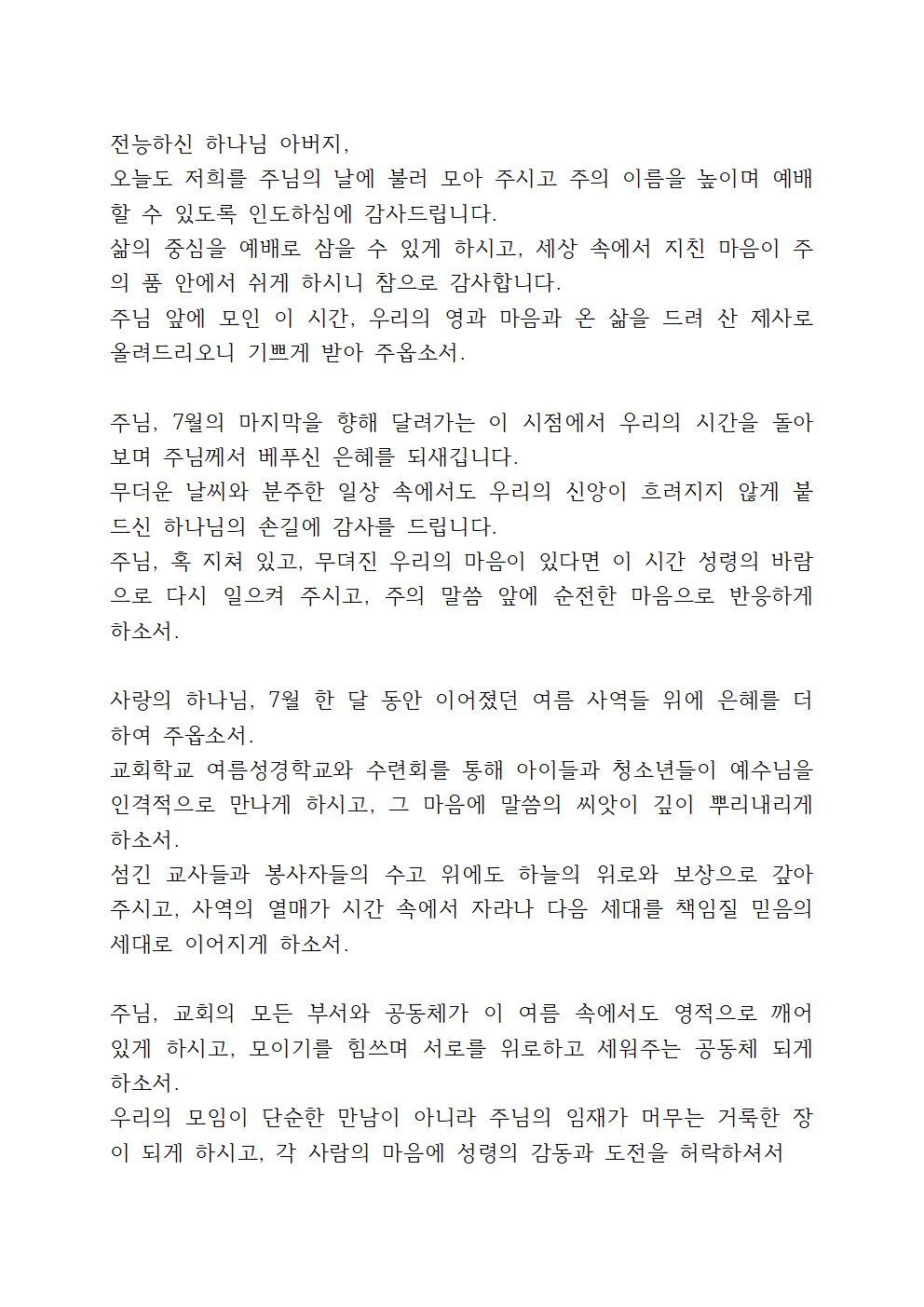 7월 수요예배 대표기도문
