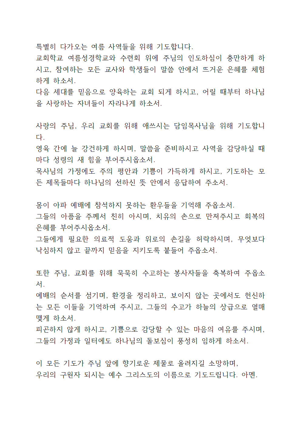 주님, 여름 사역이 본격적으로 시작되는 이 계절에 우리 교회를 사용하여 주시기를 간구합니다. 성도들의 삶 속에 말씀과 기도가 살아 움직이며 교회가 지역과 이웃에게 복음의 통로가 되게 하소서. 특별히 다음 세대를 위한 수련회와 성경학교, 선교활동 가운데 하나님의 영광이 선포되며, 많은 영혼이 주님께 돌아오게 하옵소서.