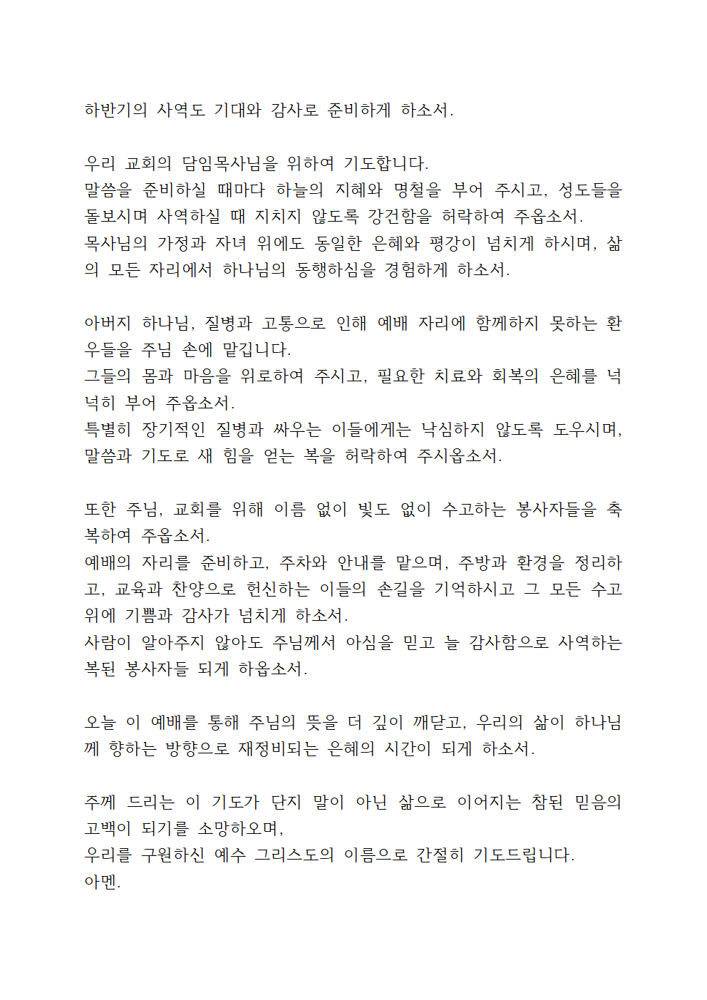 또한 각 부서와 예배의 현장에서 봉사하는 이들을 기억해 주옵소서. 한 주의 분주함 속에서도 예배의 자리와 섬김의 자리를 지켜가는 손길마다 하늘의 평강과 보람이 가득하도록 복 내려 주시옵소서. 그들의 헌신이 헛되지 않게 하시고, 그 삶에도 동일한 은혜의 열매가 맺히게 하옵소서.